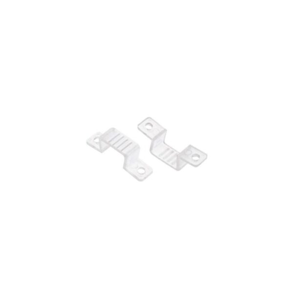 Abraçadeira em PVC transparente para fixação segura de fitas LED 230V em ambientes internos, garantindo organização e acabamento discreto. Proteção IP20. Parafusos não incluídos.