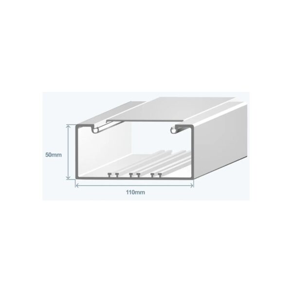 Calha de 110×50 mm branca. Vendida em calhas de 2 metros, é indicada para a gestão de cabos em instalações elétricas e de redes. Oferece organização, proteção e acesso rápido aos cabos, mantendo o espaço limpo e seguro. Adequada para montagem em parede ou teto com suportes padrão, fornece uma solução estável e profissional.