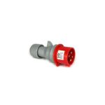 Ficha macho industrial, ideal para aplicações em ambientes com exposição moderada à umidade e poeira. Possui 5 polos, tensão nominal de 400V e corrente nominal de 16A. Conexão através de terminais parafusados com contatos em latão, garantindo alta condutividade e durabilidade. Corpo em material resistente nas cores cinza e vermelho, conforme padrão internacional.