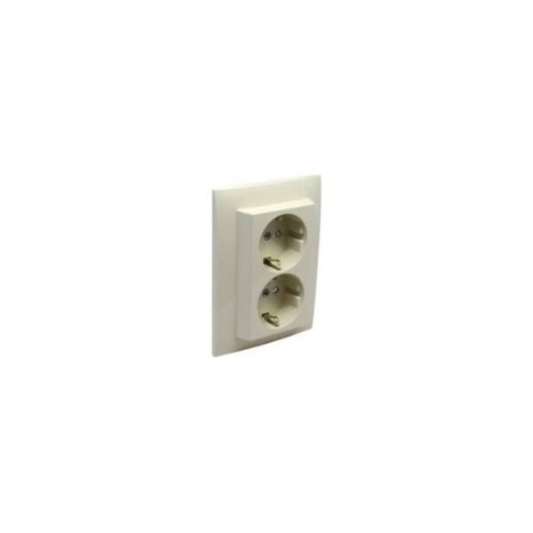 Tomada dupla Schuko monobloco com obturadores de segurança, em acabamento marfim. Permite a ligação simultânea de dois equipamentos num único ponto, garantindo maior proteção contra contatos acidentais e uma instalação prática, robusta e de fácil integração em ambientes residenciais ou comerciais.