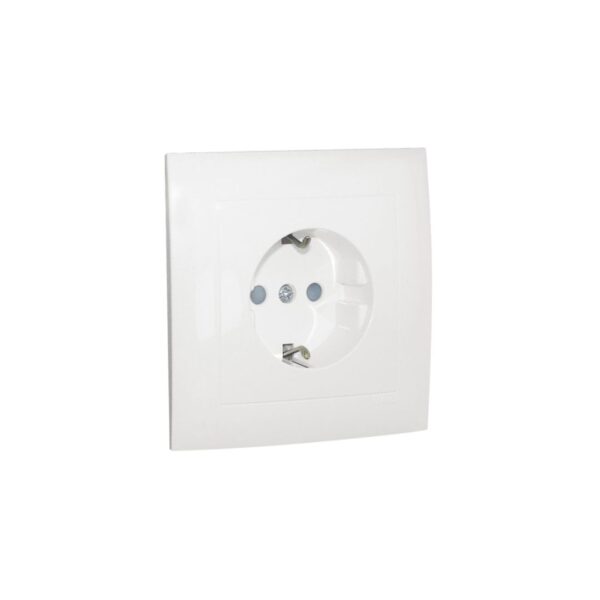 Tomada Schuko monobloco com obturador, em acabamento branco. Destinada a instalações elétricas embutidas, garante maior segurança graças aos alvéolos protegidos e oferece uma solução robusta, funcional e de fácil integração em ambientes residenciais ou comerciais.