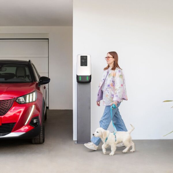 Uma estação de carregamento pública nas dimensões de uma wallbox. A alimentação única para ambas as tomadas, a tela ampla e a conectividade completa tornam o Duo um carregador adequado para uso tanto em ambiente doméstico quanto em público.